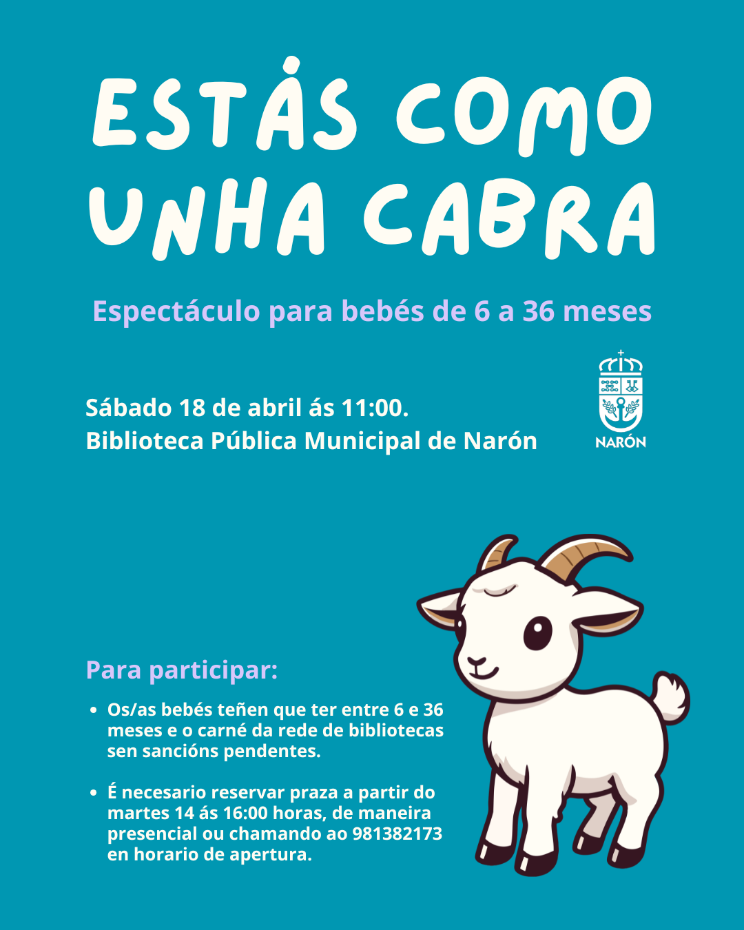 El sábado 18 de abril a las 11:00 h la biblioteca se convertirá en un espacio lleno de emociones, colores y descubrimientos con la visita de la compañía Lalá Teatro, que presentará el espectáculo para bebés de 6 a 36 meses titulado Estás como una cabra.