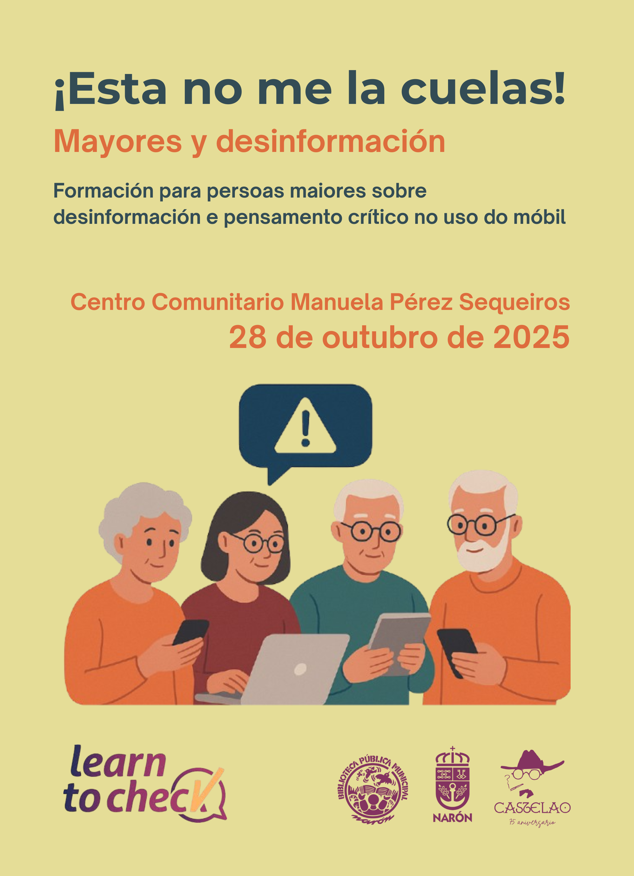 La sesión se llevará a cabo el martes 28 de octubre en el Centro Comunitario Manuela Pérez Sequeiros y estará destinada a las 12 personas que actualmente participan en el curso de manejo del teléfono móvil inteligente. Durante la jornada, se abordará de forma amena y accesible qué es la desinformación, por qué se difunde, qué impacto puede tener en los derechos de las personas y cómo detectarla a tiempo. También se practicará el uso de algunas herramientas digitales básicas de verificación.