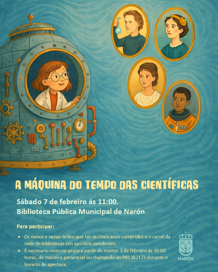 O sábado 7 de febreiro a compañía Trémola Teatro tráenos á biblioteca actividade infantil A máquina do tempo das científicas, un contacontos teatralizado pensado para público miúdo con ganas de descubrir, preguntar… e viaxar no tempo sen mover os pés do chan.