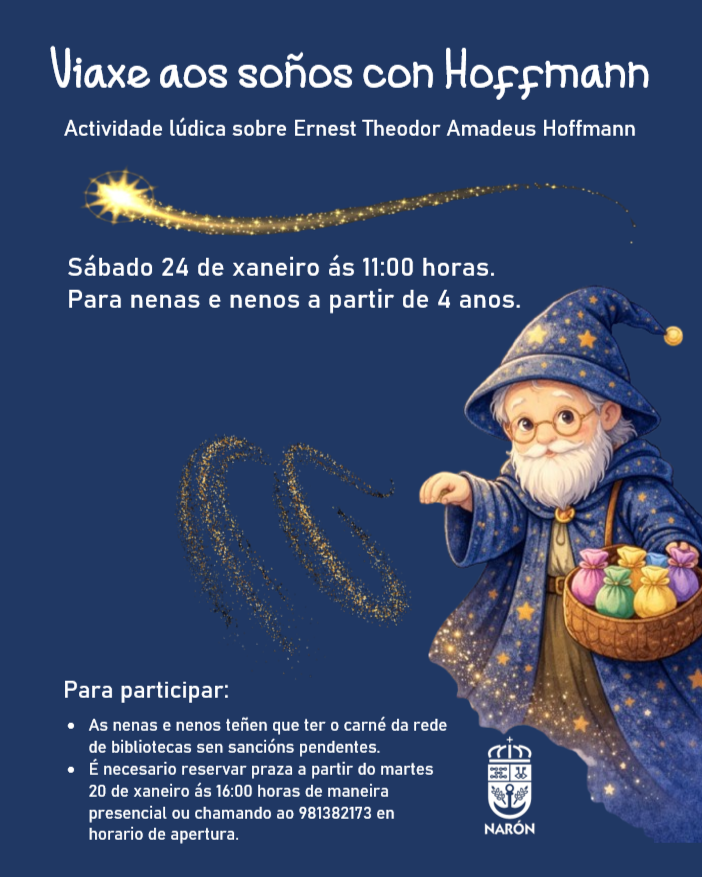 Na Biblioteca Pública Municipal de Narón convidámosvos a mergullarvos no universo máxico e imaxinativo do escritor alemán Ernest Theodor Amadeus Hoffmann, coincidindo coa celebración do 250 aniversario do seu nacemento.
