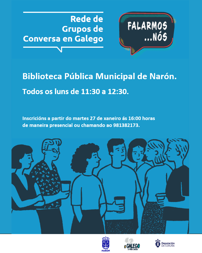 A partir do vindeiro mes de febreiro poñemos en marcha Falarmos... nós, un grupo de conversa en galego para persoas que queren usar máis a nosa lingua no seu día a día ou mellorar a súa expresión oral nun ambiente seguro e acolledor. Unímonos así a este proxecto impulsado pola Área de lingua da Deputación da Coruña, que aposta por crear espazos reais de uso da lingua baseados na participación e na conversa.
