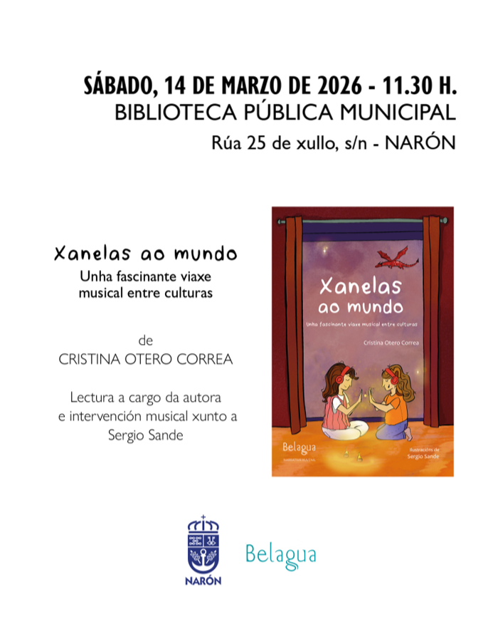 O sábado 14 de marzo, ás 11.00 horas, Cristina Otero presenta na biblioteca o seu libro Xanelas ao mundo, a tavés dunha proposta literaria e musical cunha duración aproximada de 30 minutos que combina lectura dramatizada, interpretación sonora e elementos audiovisuais.